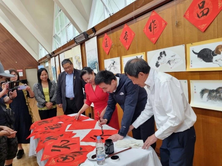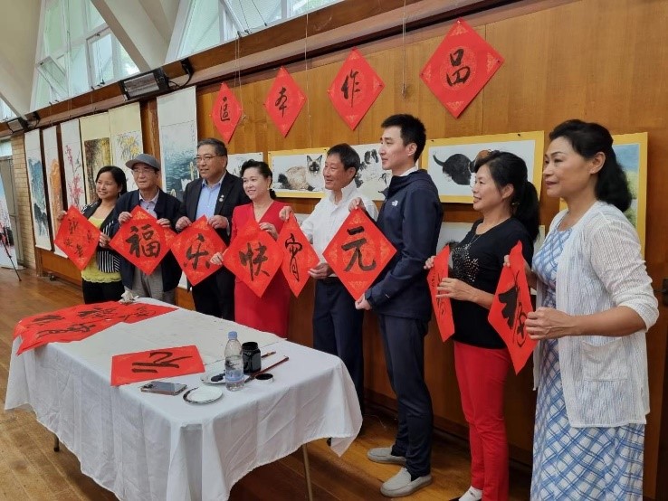 联欢会开幕前,在陈水珍会长等联合会副会长们的陪同下,王副总领事和吴凯领事兴致勃勃的观看了由新西兰中华文化艺术学院承办的非遗文化展位和区本院长的个人书画展。王副总领事小试笔墨,写下了“元”字,以庆祝元宵节的来临。
