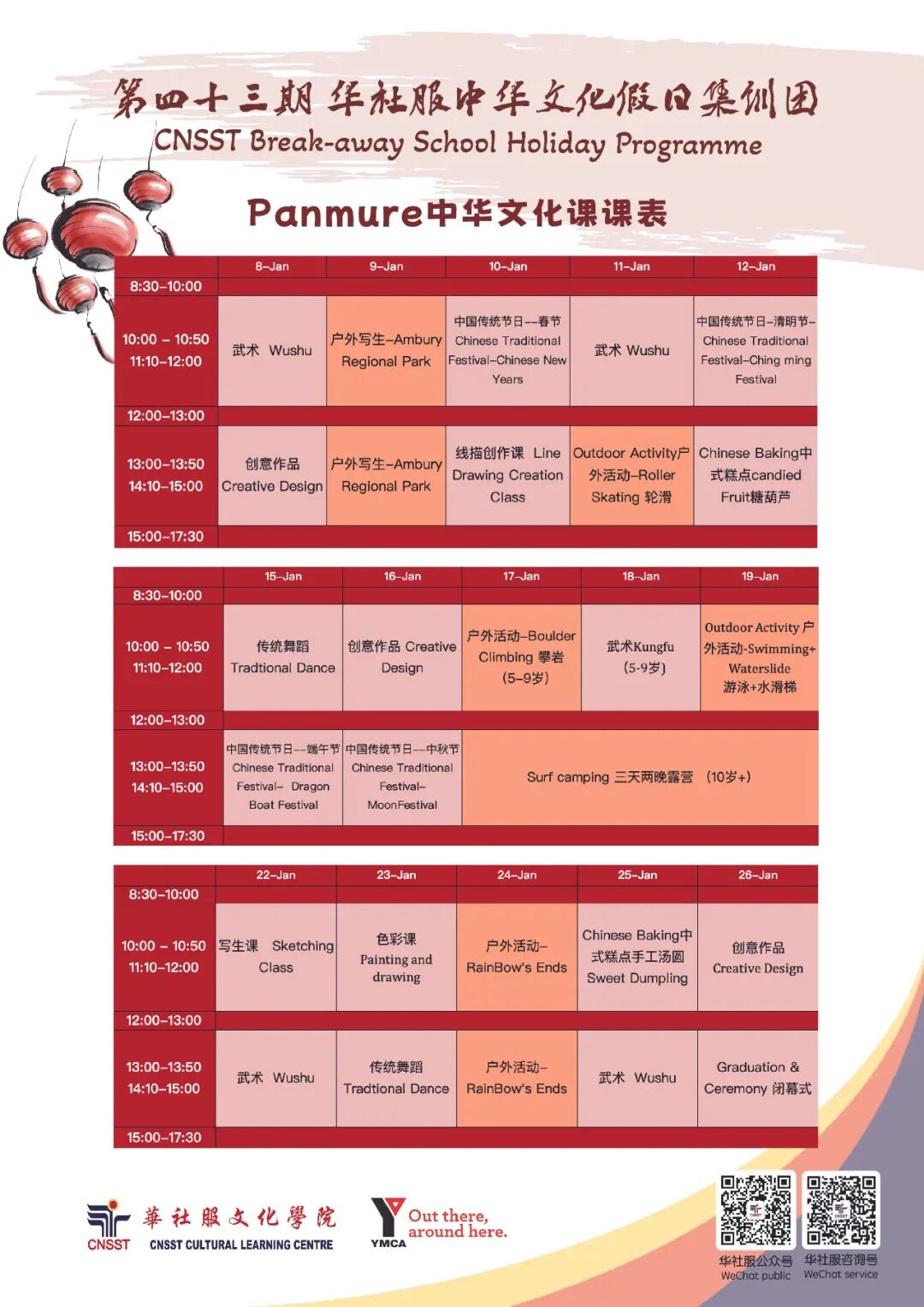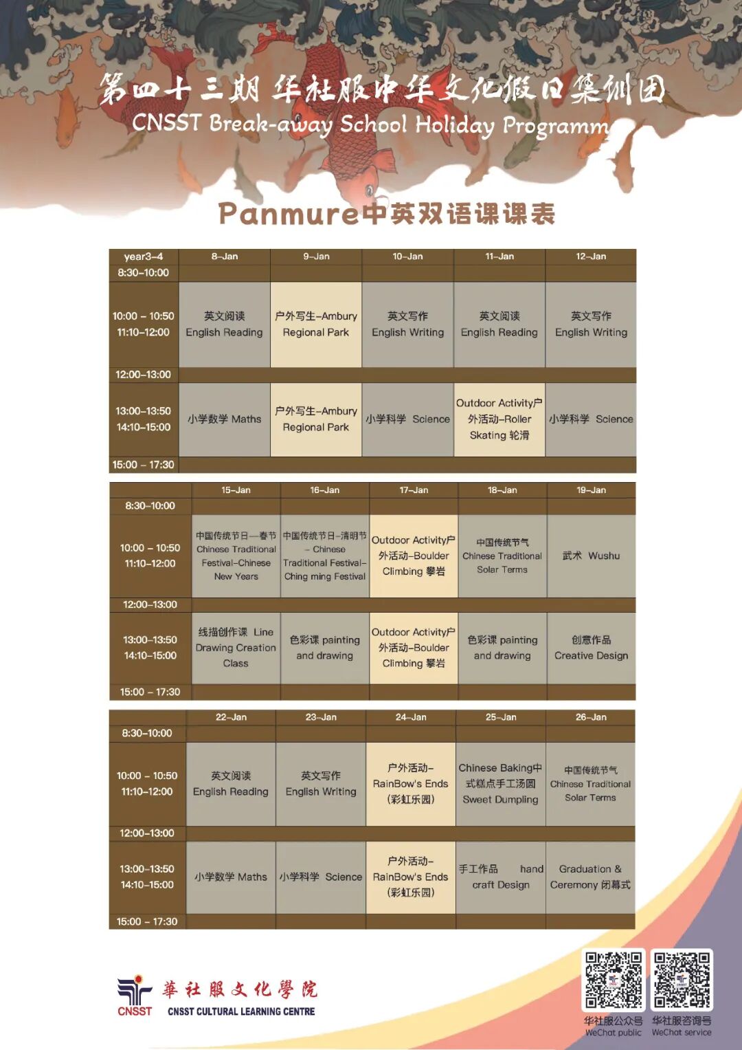 开设了文化课程,中国传统文化中的传统节日和节气,还有中国传统绘画作品欣赏和讲解,线描创作,色彩创作,传统中式糕点,传统武术和防身术等,同时安排了传统民族舞蹈和民族服饰体验,还有乒乓球,踢毽子和空竹等活动。每周都安排户外活动包括户外写生,攀岩,轮滑,彩虹乐园,特别是还有3天2夜的冲浪露营(限10岁以上参加)等丰富多彩的优质活动,让孩子们在欢乐的体验中学习到中华文化,培养团队合作精神。