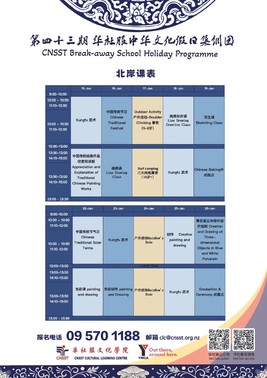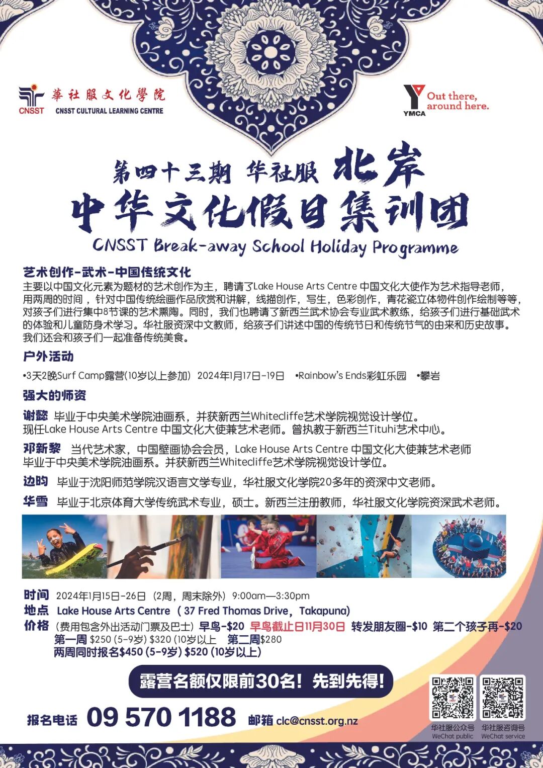 最后报名机会:1月8日下周一华社服北岸中华文化假日集训团开团啦!名师授课、线描色彩/青花瓷立体物件创作,冲浪露营,传统美食!