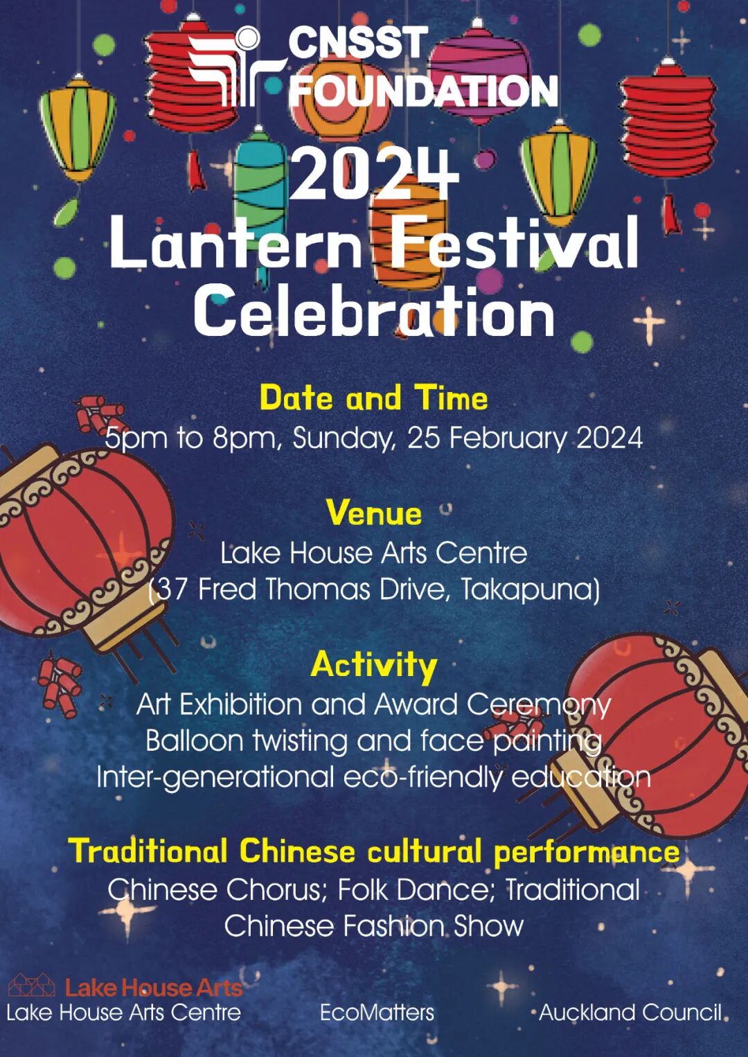 新西兰华社服基金会与Lake House Arts Centre精心策划,将于2月25日周日晚五点至八点,在Lake House Arts Centre举办欢庆灯节活动,诚邀您和家人的参与!