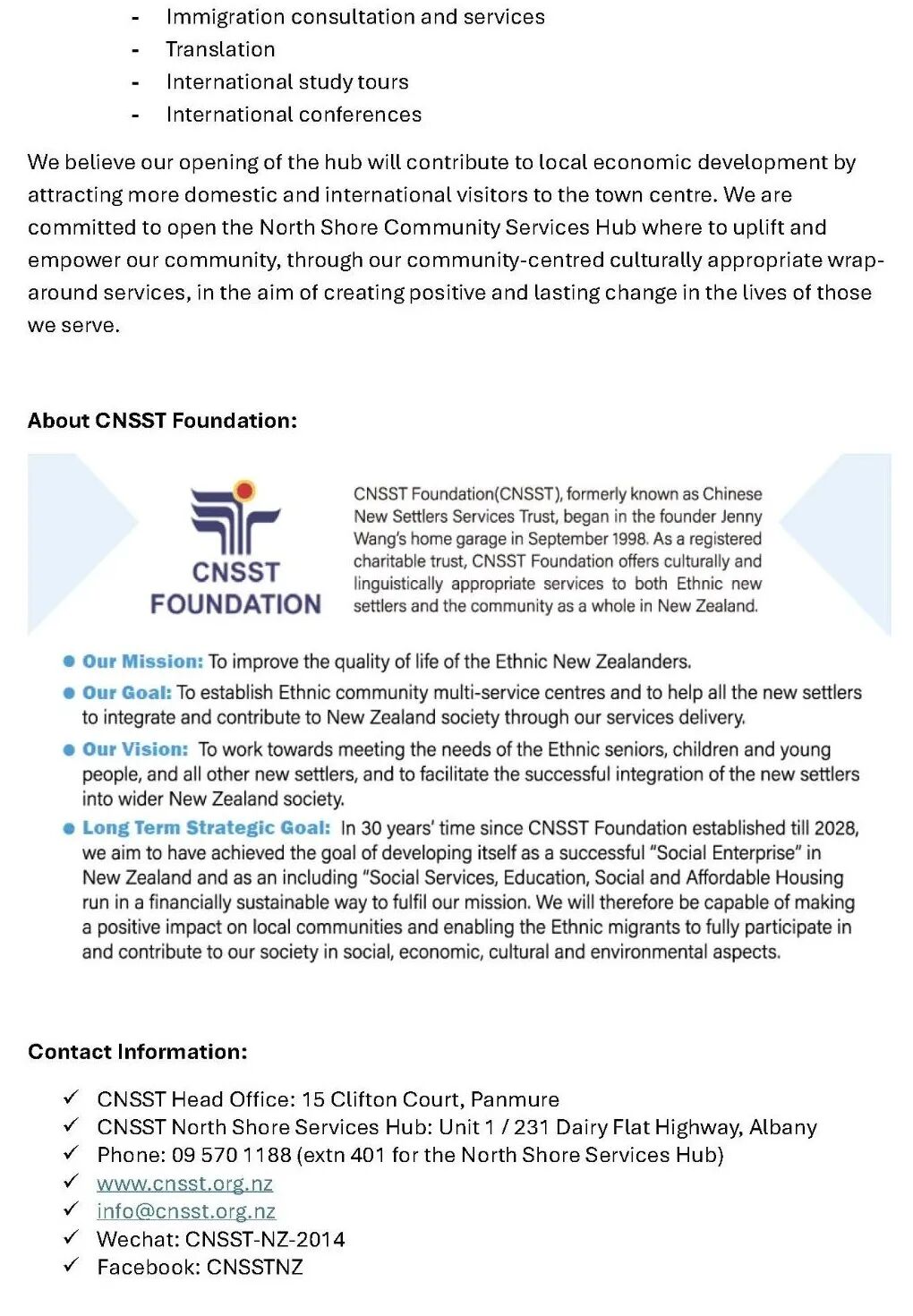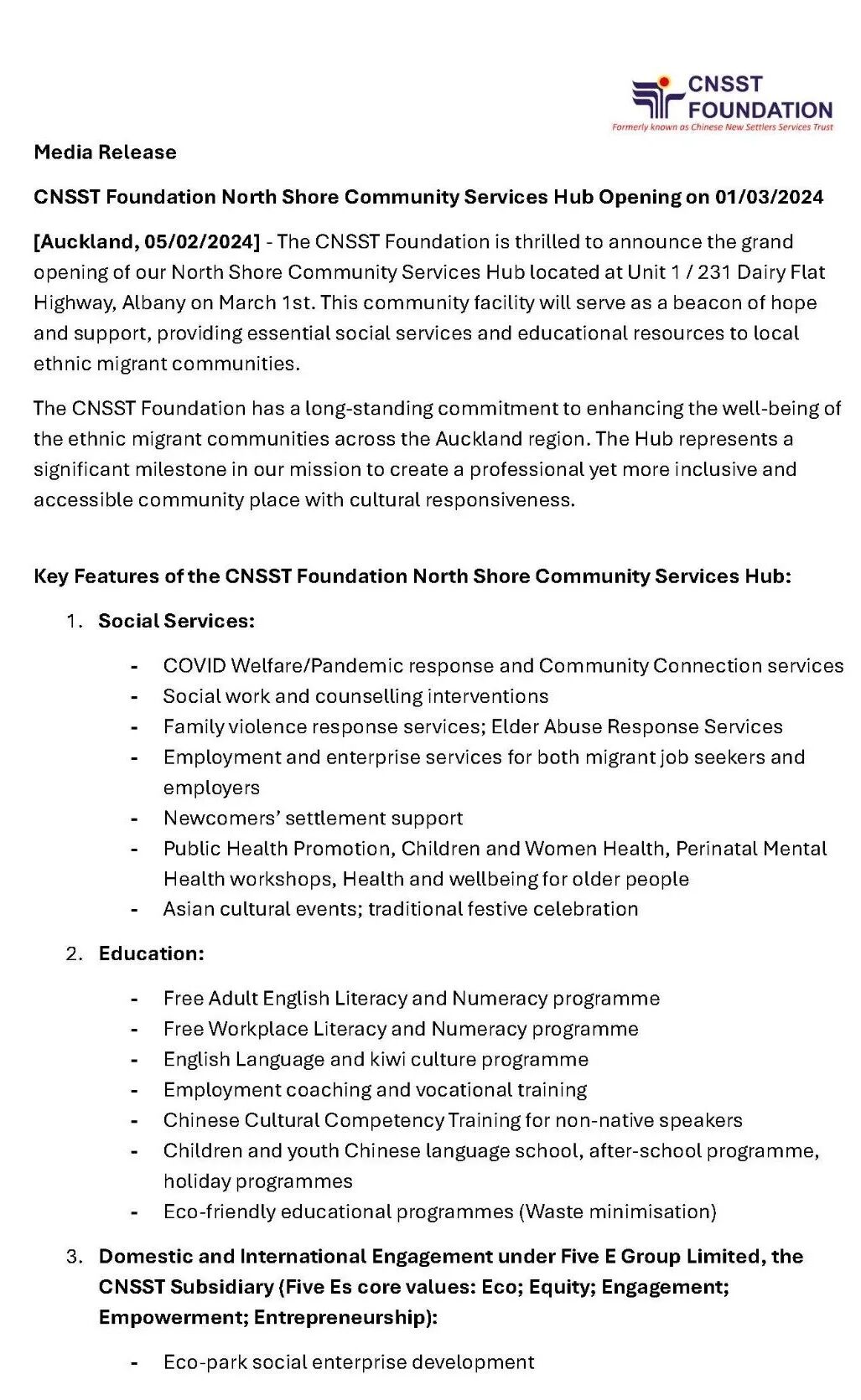 202431日,龙年吉日,气爽秋高,我们迎来了一个值得欢庆的日子,新西兰华社服基金会北岸社区服务基地正式开放。在华社服北岸社区服务基地门前,祥龙飞舞,锣鼓喧闹,共庆开业盛典,人群欢笑。这一天,华社服北岸基地正式向大家敞开大门,为北岸华人朋友们建立起了一个温馨的