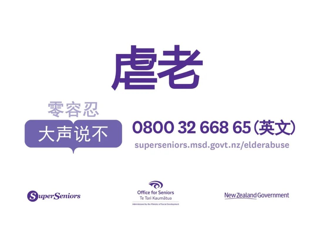 在新西兰社会发展部和老年部支持下,华社服基金会将于6月19日起开放反家暴关爱长者热线,每周一至周六早九点至下午五点为有需要的长者朋友们提供中文服务。敬请关注华社服微信公众号。