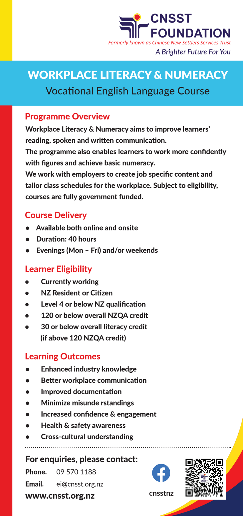职场英语与计算课程专为企业量身定制,旨在提升员工 书面与听说交流能力,以及计算能力。我们基于工作场所实际需求,与雇主共同设计课程内容,安排课程时间。本课程为新西兰政府资助项目,符合条件者免学费。