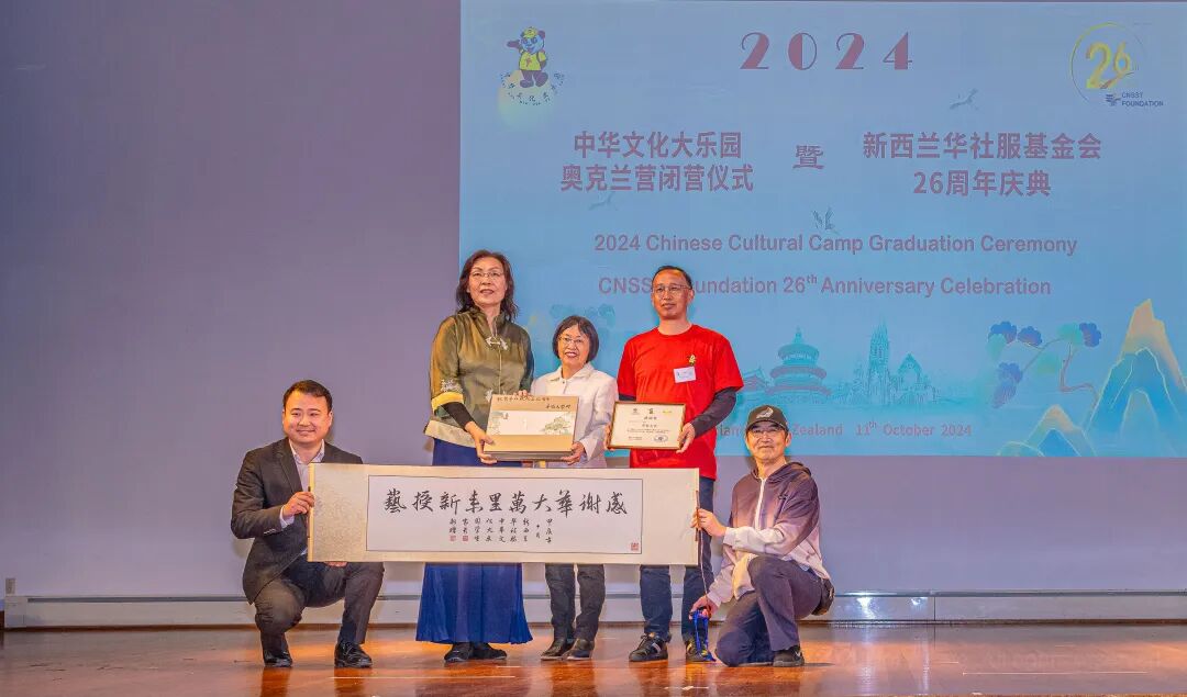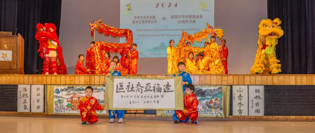 在闭营仪式的表演中,孩子们带来的节目令观众大为赞叹,尤其是为庆祝新西兰华社服基金会CNSST Foundation 26周年庆精心编排的“龙腾狮跃庆华诞”表演更是让全场震撼不已。舞台上,两条红黄相间的巨龙舞出了“26”字样,象征着新西兰华社服基金会CNSST Foundation 26年来的辉煌历程,两头雄狮腾跃而起,寓意着雄狮献瑞、招财进宝。与此同时,台下的书法家也为新西兰华社服基金会献上了珍贵的墨宝——“造福亚裔社区”,为庆典增添了更加浓厚的文化氛围。