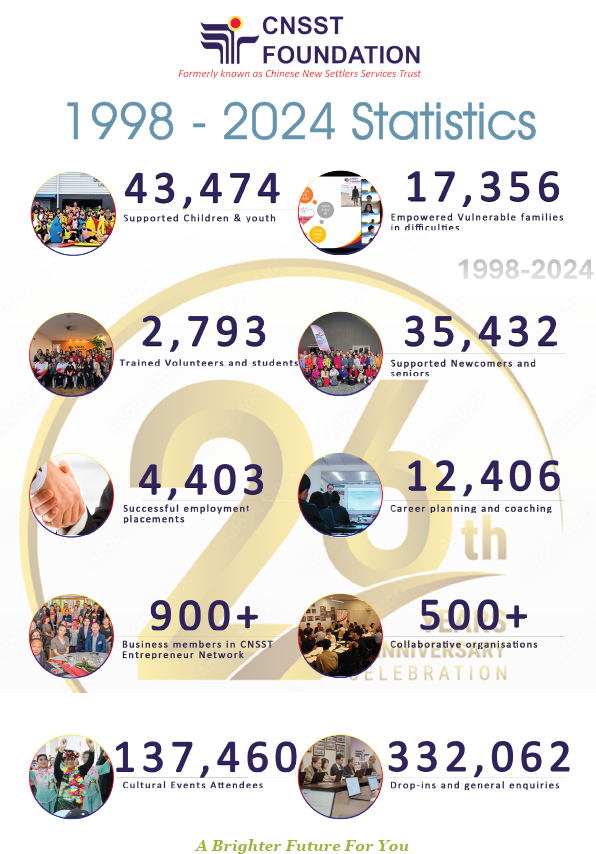 新西兰华社服基金会CNSST Foundation成立26年来,始终致力于服务新西兰亚裔社区,通过社会服务、教育和文化项目,为亚裔家庭和社区带来了诸多福祉,每年服务人群在15,000以上。自1998年成立以来,为移民社区提供广泛的语言和文化相适应的社会服务、教育、社会房屋等综合服务。