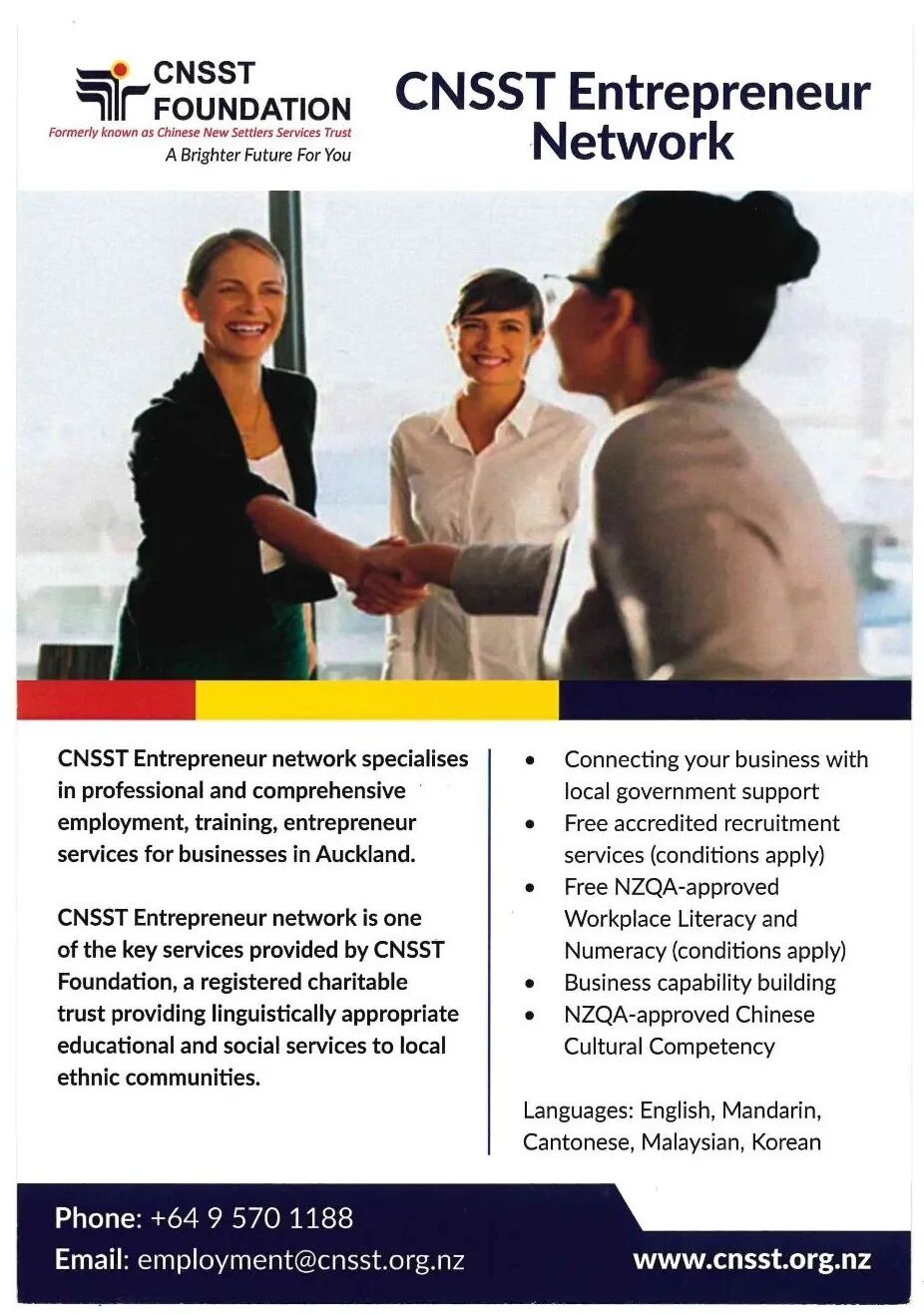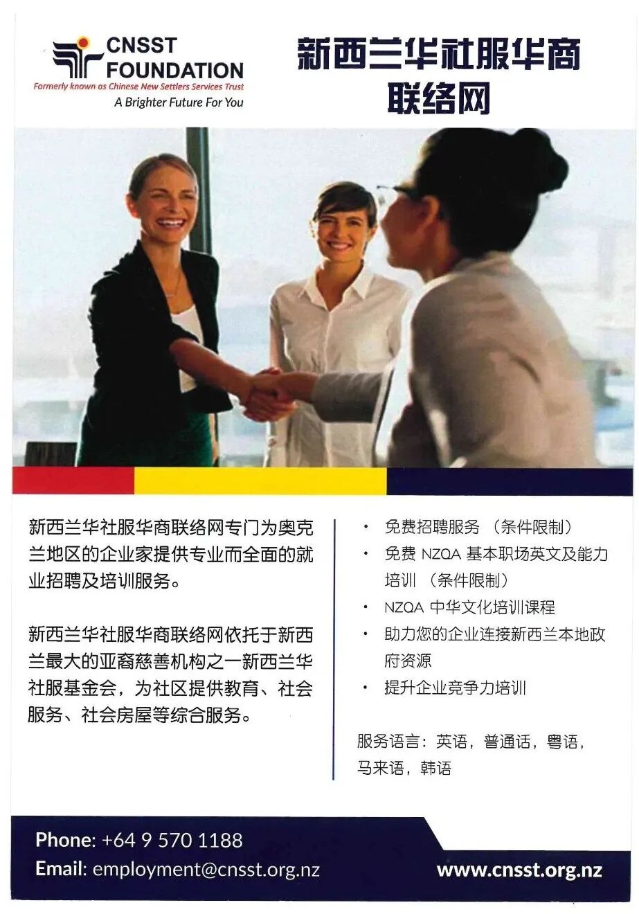 华社服就业及企业部成立于2001年,在新西兰社会发展部的支持下,多年来致力于为移民社区提供职业规划、培训及招聘等服务。作为雇主和雇员间的桥梁,我们为奥克兰商家提供语言和文化相适应的综合服务: