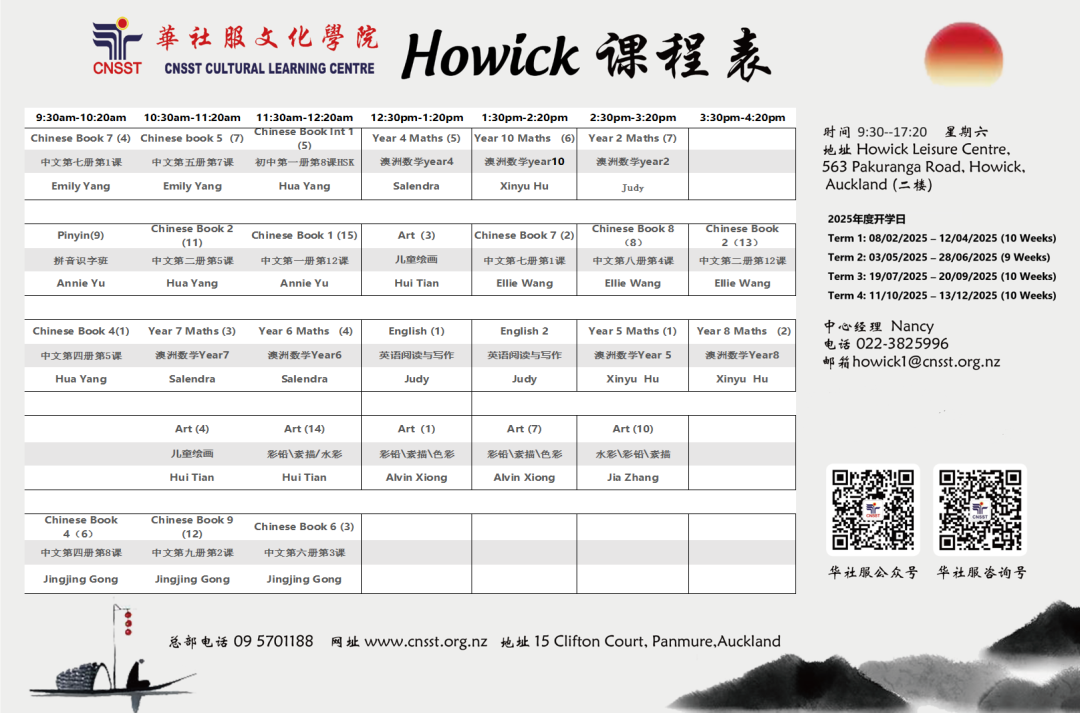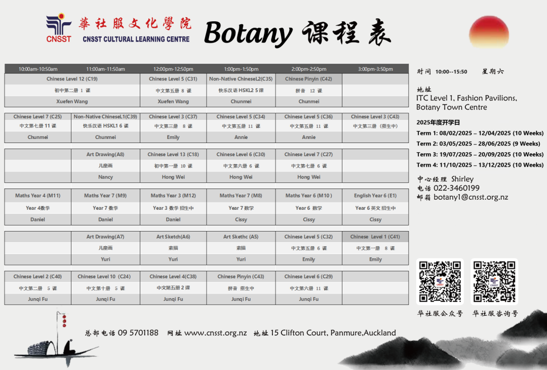 华社服文化学院隶属于华社服基金会,在大奥克兰地区设有4所分院、3个After School校点以及线上课程,致力于为社区提供优质的教育资源。我们的4所分院分别位于Howick、Botany、Parnell和North Shore,此外还在Pigeon Mountain小学、Point View小学和Murrays Bay小学设有After School课后辅导课程。我们的教师队伍由具备当地学历和专业知识的资深教育工作者组成,教学经验丰富,充满爱心和责任感。学院对教学质量实施严格监管,确保为每位学生提供高水平的学习体验。 • 统一教材与进度:采用统一的教学大纲和教材,确保课程连贯性和系统性。 • 展示才华的平台:为孩子们提供多样化的学习和展示机会,例如: • 每年举办的青少年中文演讲比赛、美术作品比赛和武术比赛在华社服文化学院,孩子不仅能获得知识的提升,更能感受中华文化的魅力,成长为自信、全面发展的优秀人才。