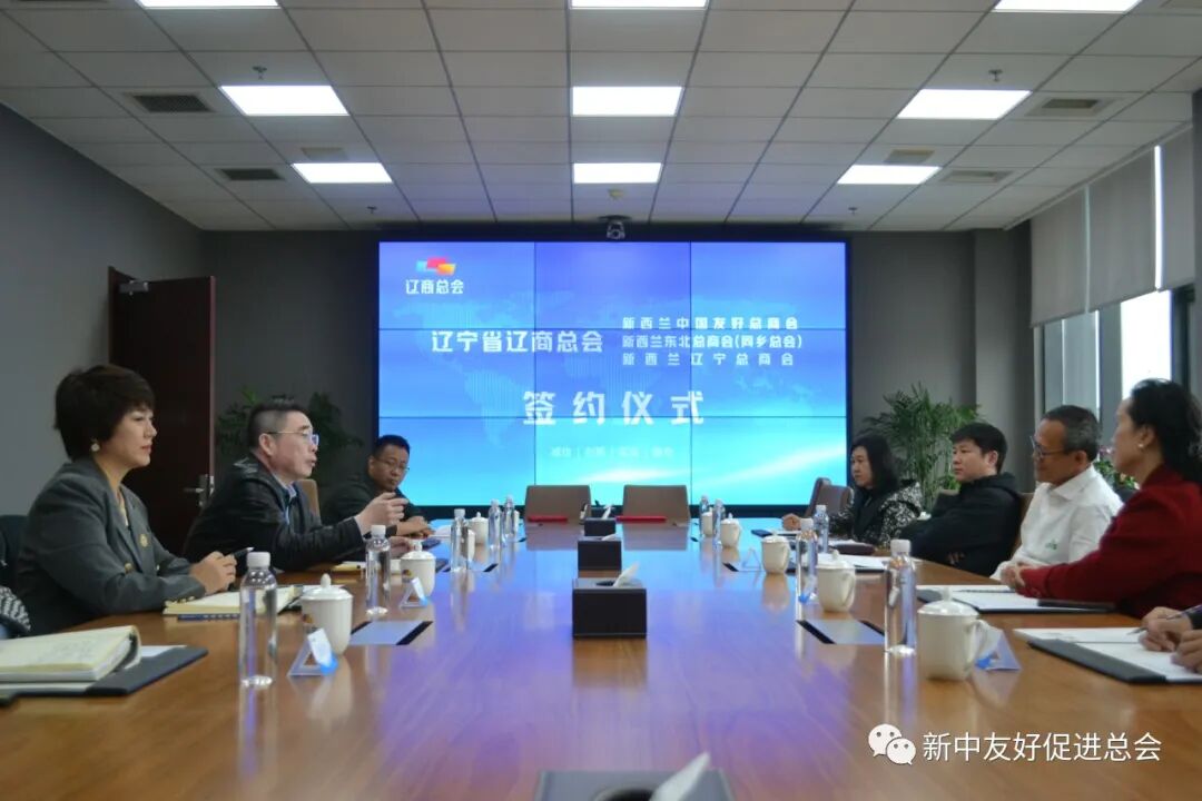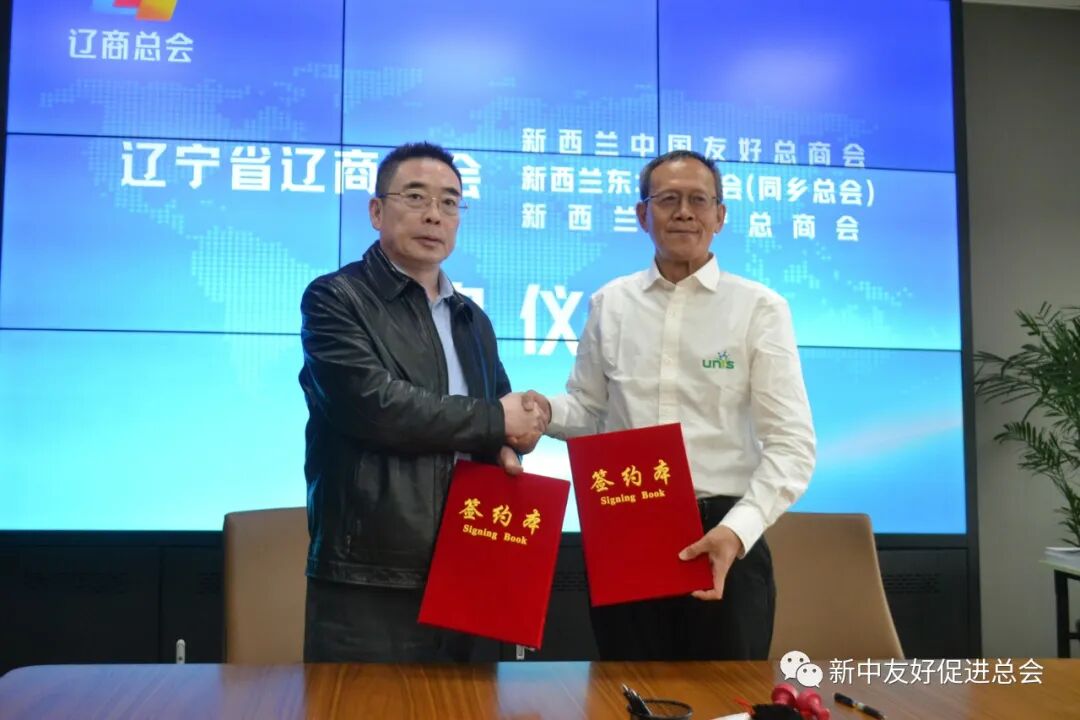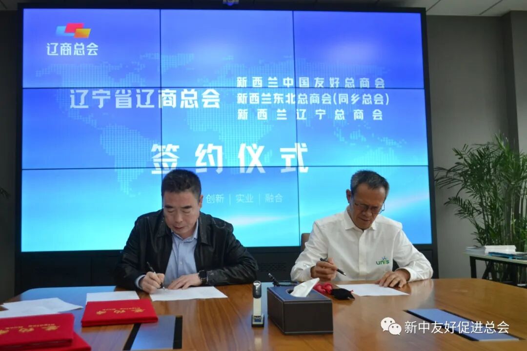 会上,辽宁省工商联党组成员、辽商总会秘书长周福辉与新西兰中国友好总商会会长、新西兰东北总商会(同乡总会)理事长丁新进行签约。
