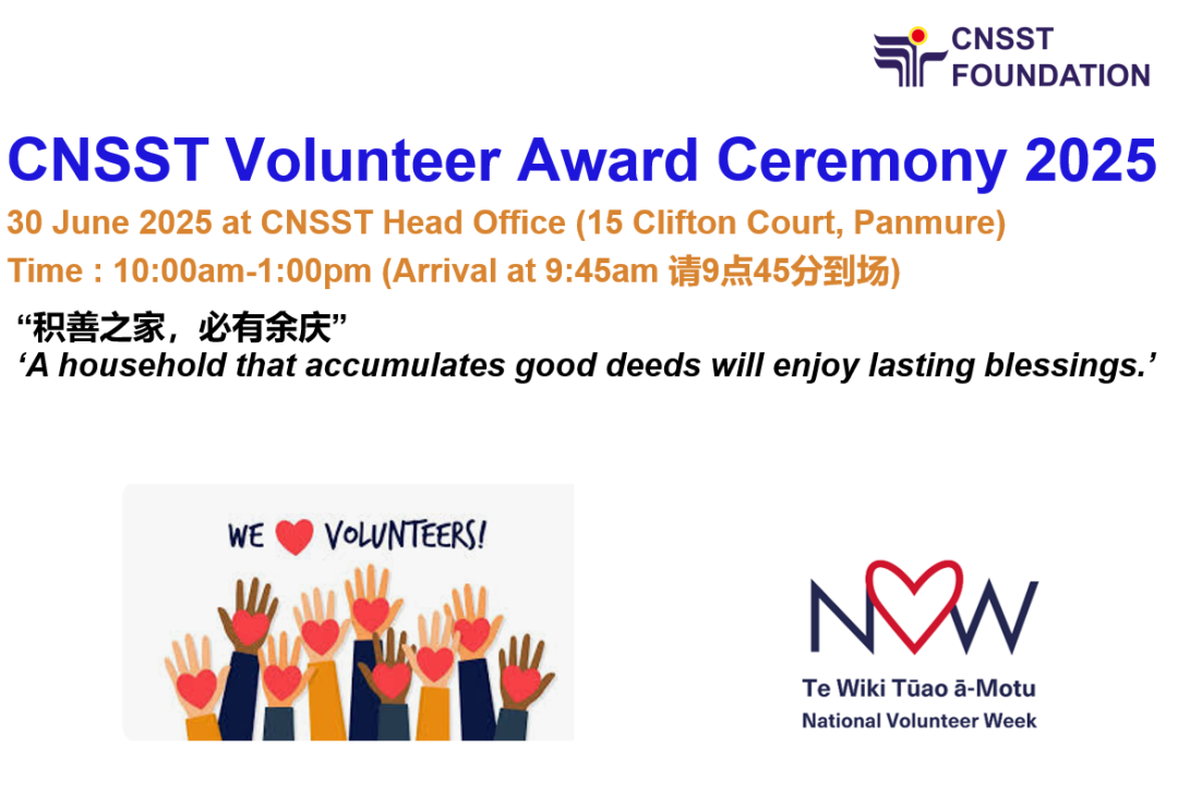 如果您想加入华社服基金会义工团队,欢迎联系我们! 发送简历至 info@cnsst.org.nz “积善之家,必有余庆。” 华社服基金会团队感谢我们每一位义工,您们是最可爱的人!感谢每一位义工,是你们让社区更美好,让善意生生不息。华社服基金会与大家携手同行,共创更加幸福、和谐的社区!